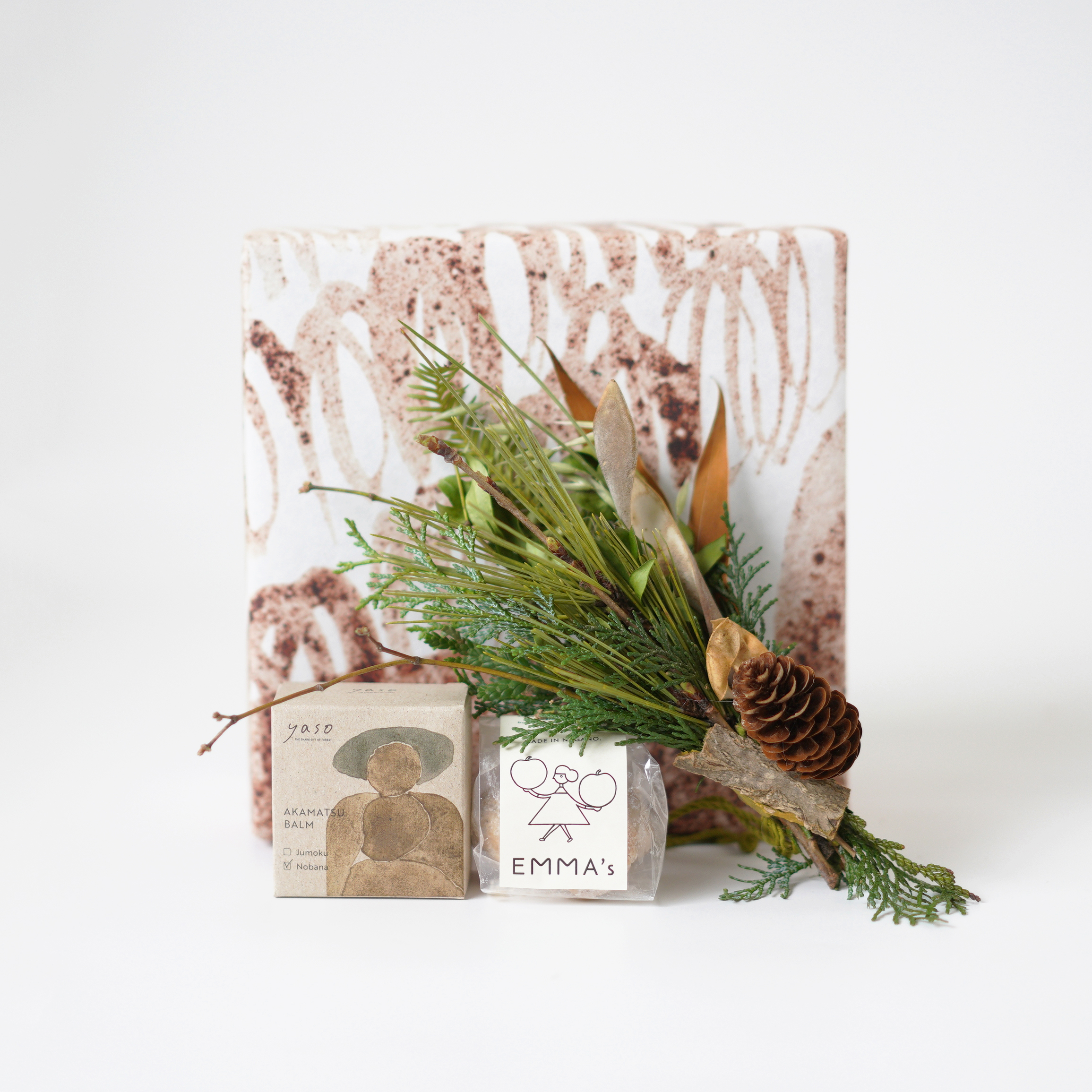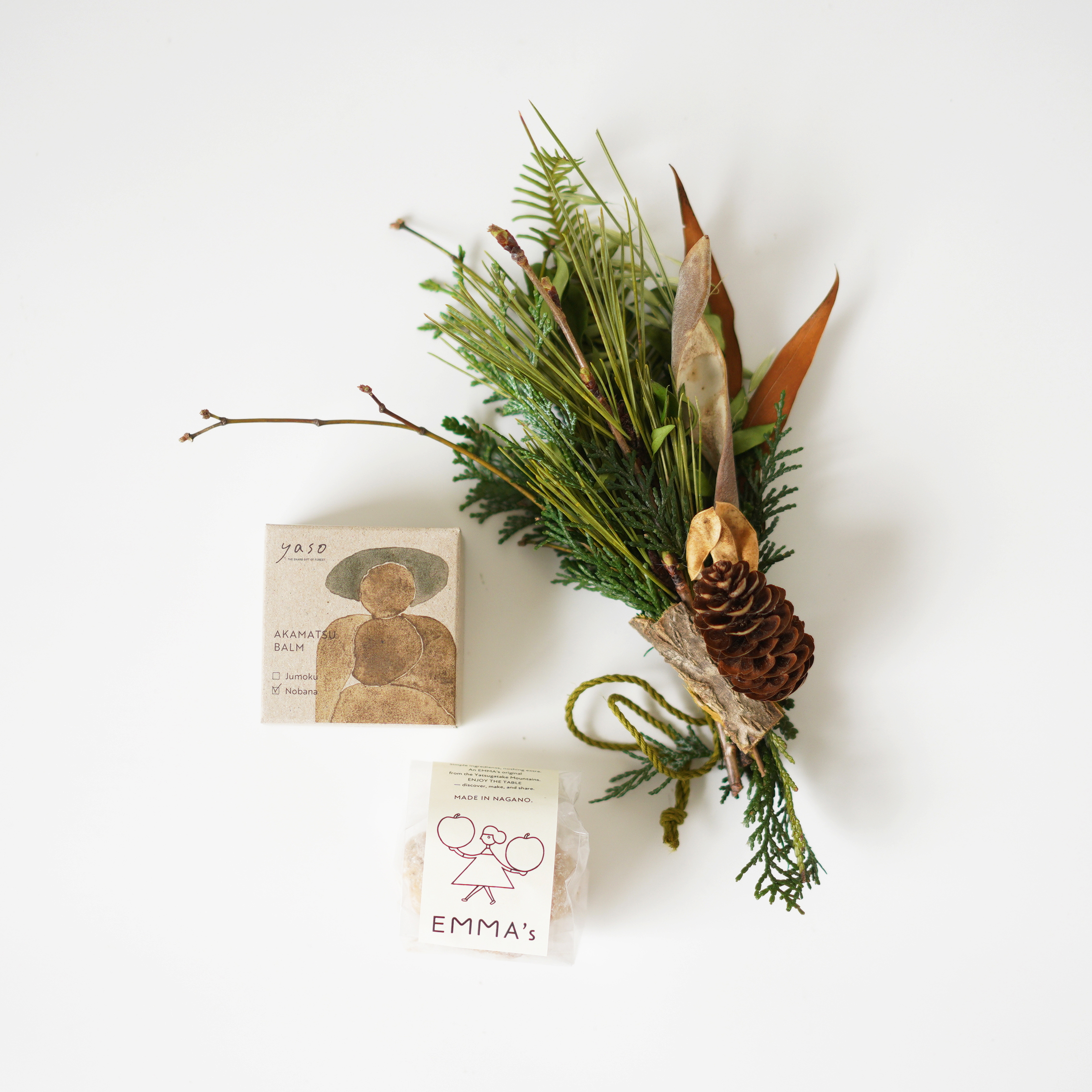 森の気配をそっと束ねたミニスワッグ、 yasoの姉妹ブランドEMMA's FOOD&GROCERYの焼き菓子、 全身保湿に使えるyasoのマルチバーム。